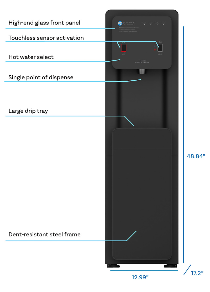 Featuring a large, 2.1 gallon cold tank, it purifies and holds plenty of water for your typical workday, making it an ideal source for fresh-tasting water in shared workspaces for about 50 people. It keeps your workplace hydrated, electrolyte-boosted and safe. For purification, the PW70 uses a 5-stage filtration process that removes sediment, chlorine, bacteria while oxygenating water for the freshest taste possible and adding a little boost of electrolytes at the end!
